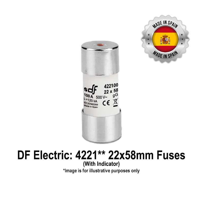 DF Electric Industrial Cylindrical Fuses: 100 Amps, 500 Vac/120 kA, Operating Class: gL-gG, Size: 22x58mm, with Indicator