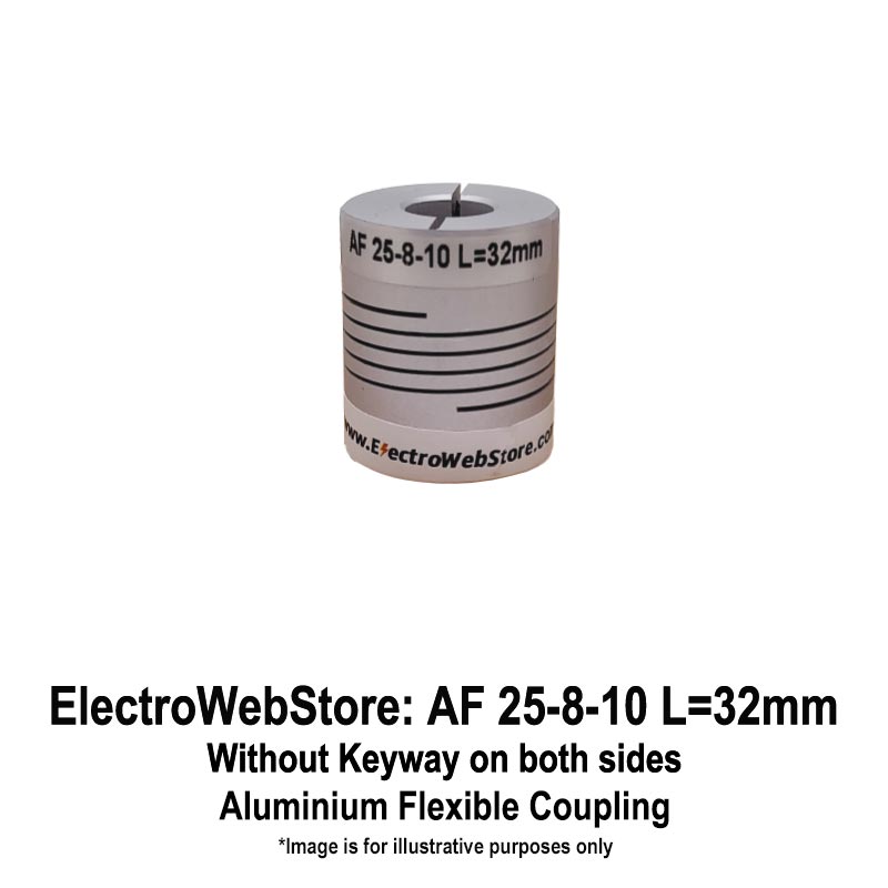 Aluminium Flexible Shaft Coupling: OD: 25mm; ID1: 8mm without Keyway; ID2: 10mm without Keyway; Length: 32mm
