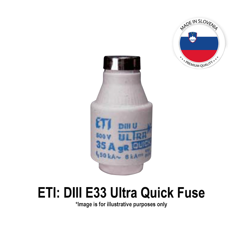 ETI Ultra Quick D/Bottle Type Semiconductor Protection Fuses: 50 Amps, 500 Vac/50 kA, 315 Vdc/8 kA, Operating Class: gR, Type: D III, Size: E33