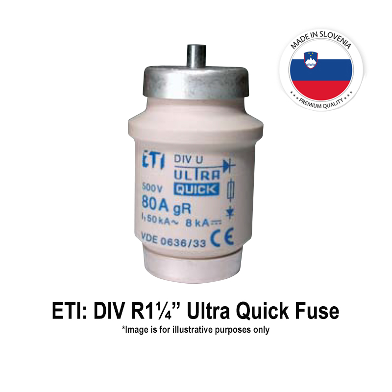 ETI Ultra Quick D/Bottle Type Semiconductor Protection Fuses: 80 Amps, 500 Vac/50 kA, 315 Vdc/8 kA, Operating Class: gR, Type: D IV, Size: R1-1/4"