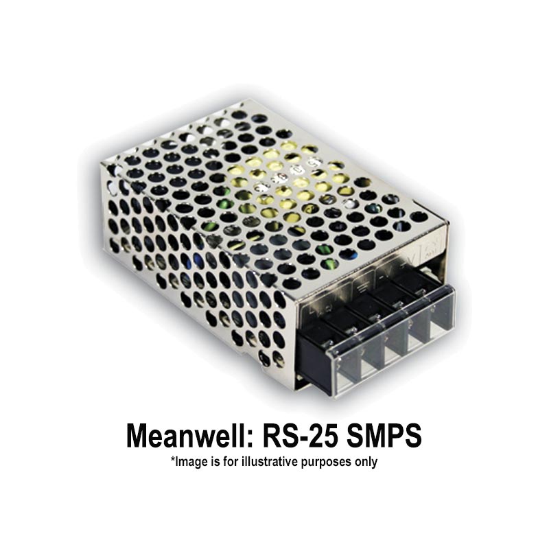 Meanwell Single Phase Panel Mounting 25 Watts SMPS, Input: 88-264 Vac/125-373 Vdc; Output: 5 Vdc/0 - 5 Amps; Tol.: +/-2%; R&N: 80 mV; Effi.: 78.5%; LxWxH: 78x51x28mm
