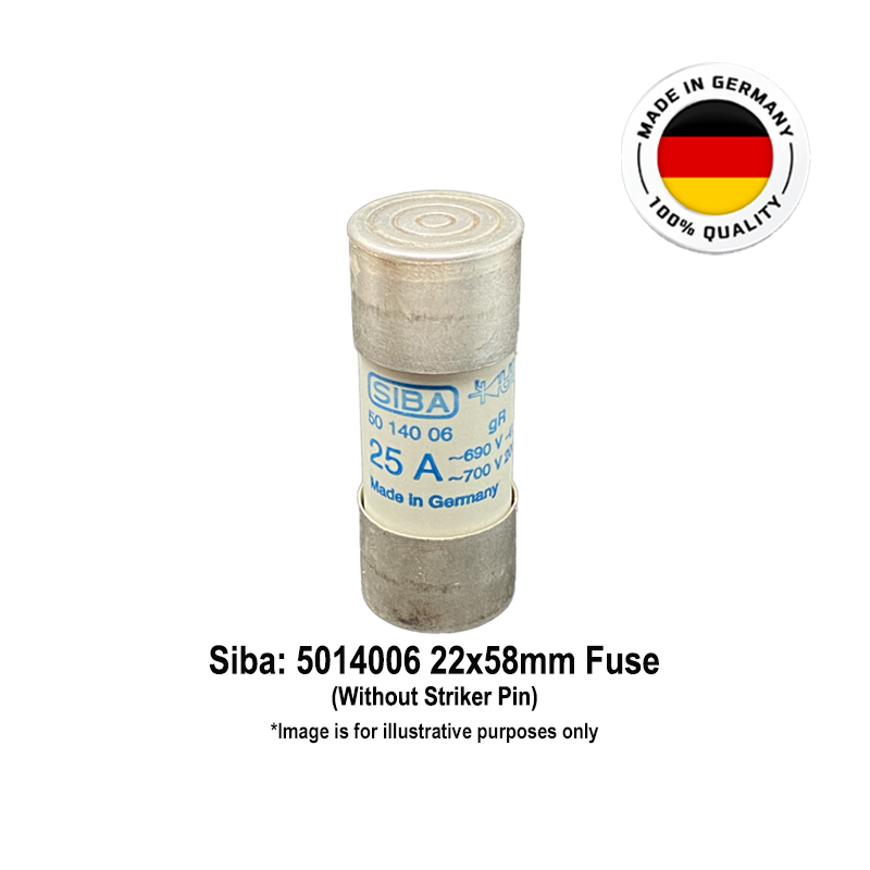 Siba Cylindrical Ultra Rapid Semiconductor Protection Fuses: 25 Amps, 690/700 Vac, 200 kA, Operating Class: gR, Size: 22x58mm, without Striker Pin